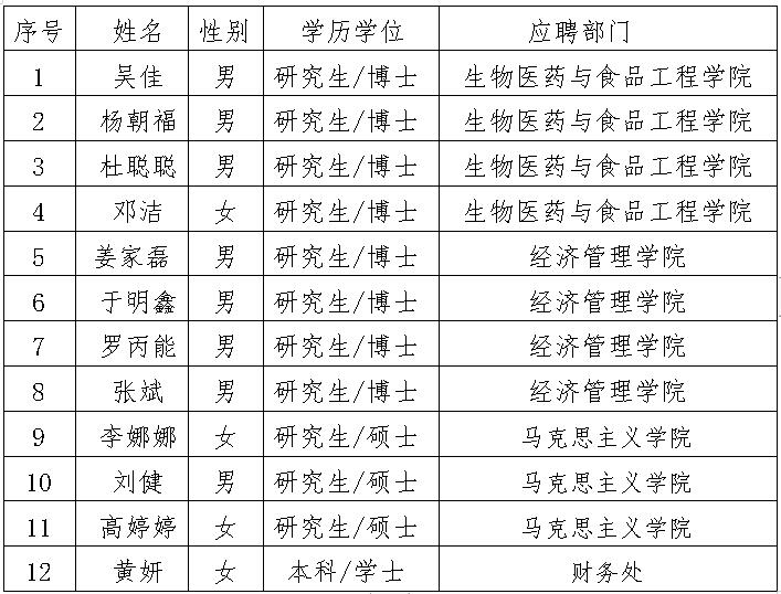 根据陕西省人社厅《关于陕西省事业单位公开招聘人员办法》规定及《太平洋在线注册官网2020年人才招聘计划》,经过资格审查、试讲、专家面试等环节考察,并经院长办公会2020年4月10日研究,同意招聘吴佳等12位同志来我校工作,现予以公示。如有异议,请于2020年4月16日前向人事处或纪委办公室反映。