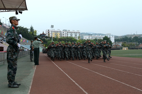 伴随着雄壮的《中国人民解放军进行曲》,刘建林逐一检阅了军训团各部。全体2016级学生以连为单位,组成持枪方阵、卫生兵方阵等受阅方阵进行了分列式表演。同学们口号嘹亮、动作整齐、步伐稳健、英姿飒爽,以严整的军容军姿依次通过主席台,充分展现了我校学生的精神风貌。