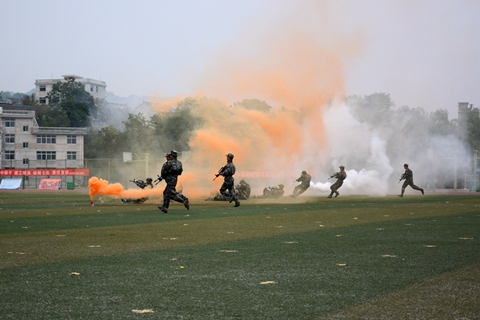 分列式结束后,我校学生进行了队列队形、军体拳和反恐战术汇报表演。伴随着悠扬的旋律,女兵用花束排出了巨大的“1976”“2016”等字样,庆祝我校建校40周年。同学们还摆出了“商院梦 中国梦”“不忘初心 继续前进”等造型,表达我校学生秉承校训,刻苦学习,报效祖国的坚定信念。由男兵表演的军体拳动作精炼、节奏分明、套路连贯、气势磅礴、喊杀声震天,赢得了现场阵阵热烈的掌声。反恐战术演练展示了战术基本持枪动作、战术手语、反恐战术队形和特种侦察部队破袭战斗。破袭战斗通过在操场搭建临时建筑物,模拟敌通信枢纽,特种侦察分队对其进行破袭,同学们配合密切,组织严谨,展示了良好的战斗技能和战术素养,将现场气氛推向了高潮。