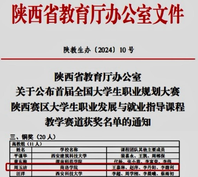 近日,陕西省教育厅公布了首届全国大学生职业规划大赛陕西赛区大学生职业发展与就业指导课程教学赛道获奖名单。我校人文学院辅导员周玉洁及其课程团队成员获得铜奖。