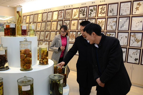 在彭虎军的陪同下,陈义德、朱先鹏、周丽娜一行参观了我校商洛红色文化资料馆、商洛文化暨贾平凹研究中心、陕西省尾矿资源综合利用重点实验室、学校办学成就展厅、秦岭植物标本室及生物医药与食品工程学院实验室等处。
