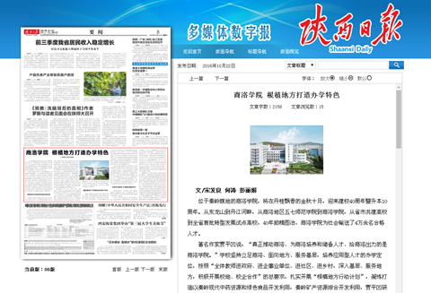 10月22日,《陕西日报》以《太平洋在线注册官网 根植地方打造办学特色》为题对我校办学成就进行报道。文章从“聚焦现代中药和绿色食品做文章,瞄准秦岭矿产资源综合利用下功夫,写商洛 画商洛 打造秦岭最美名片”三个方面,回顾了我校建校40年、升本10年来,坚持立足商洛、面向地方、服务基层,凝练打造以秦岭现代中药资源和绿色食品开发利用,秦岭矿产资源综合开发利用,贾平凹研究、秦岭画派等地方文化传承创新为代表的办学特色,深入开展“根植地方行动计划”的实践和成果。